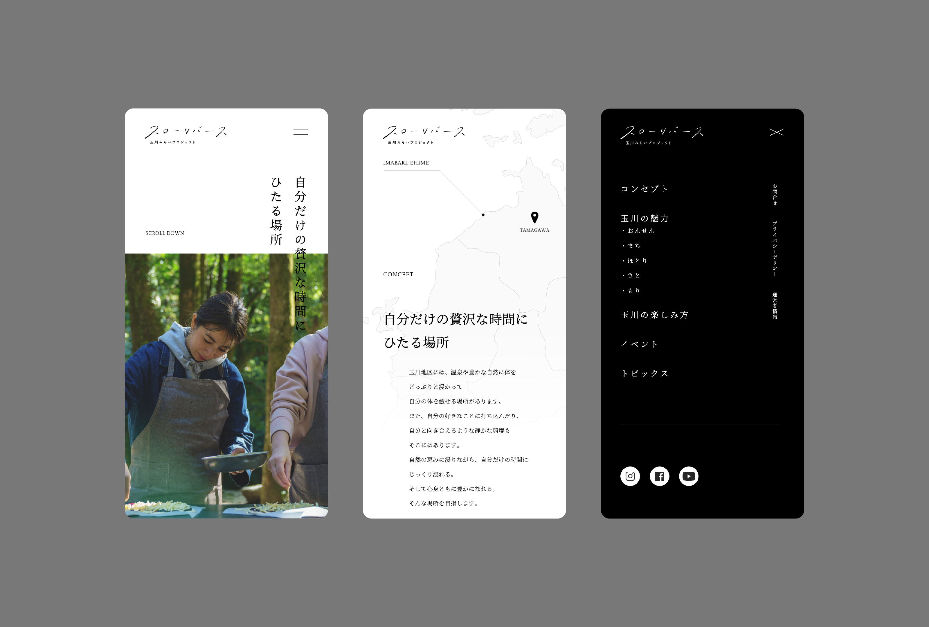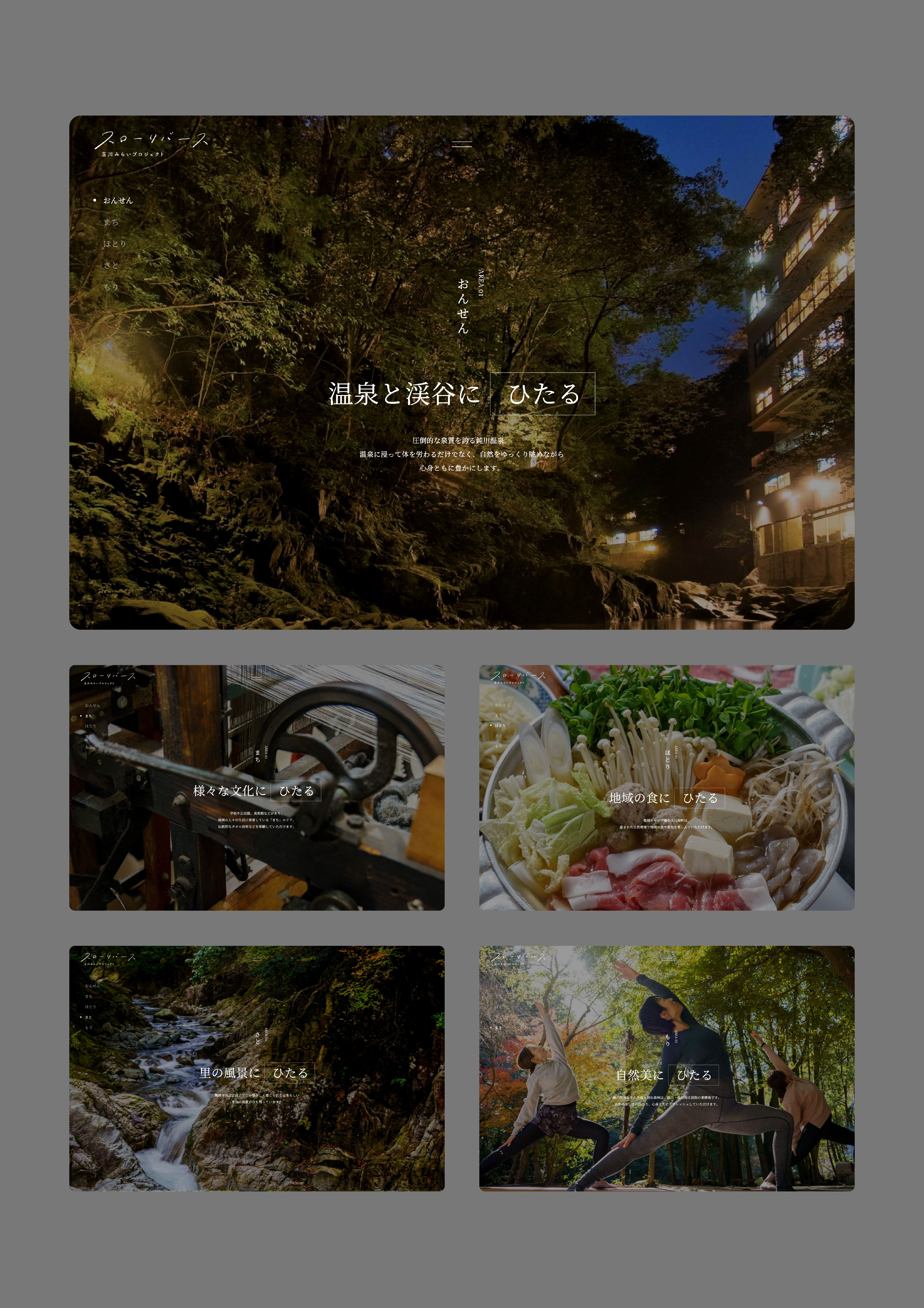 愛媛県今治市玉川町の魅力を発信するウェブサイトを制作しました。玉川の魅力を「おんせん・まち・ほとり・さと・もり」の5つのテーマに分解し、「ひたる」をコンセプトに全体を構成しています。 「玉川の楽しみ方」では、温泉や自然、静かな環境に身をゆだねながら、自分だけの時間にじっくりと浸るための具体的な滞在プランを提案。 訪れる人が心身ともに癒され、豊かさを感じられるような体験をイメージできるサイトを目指しました。